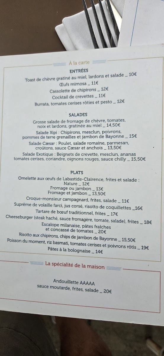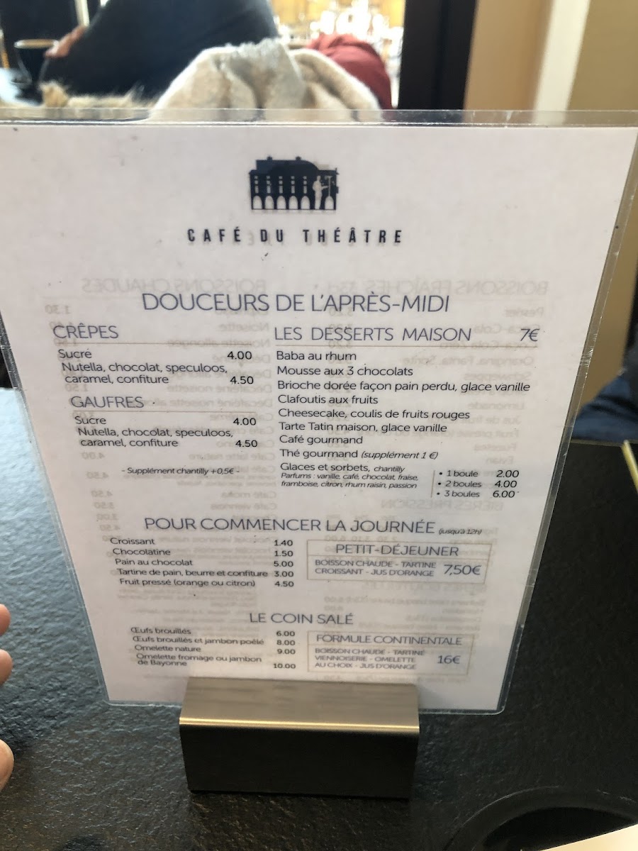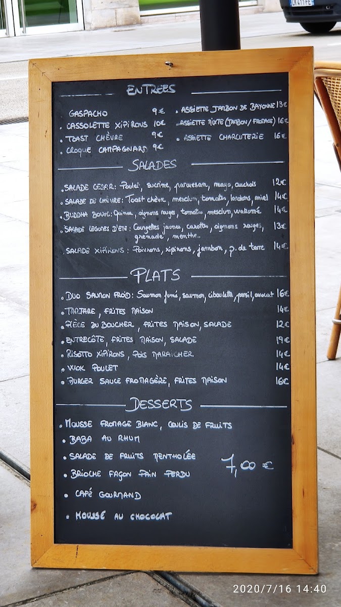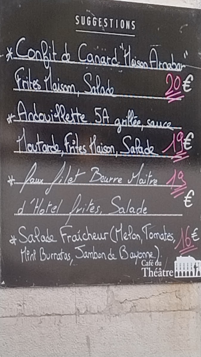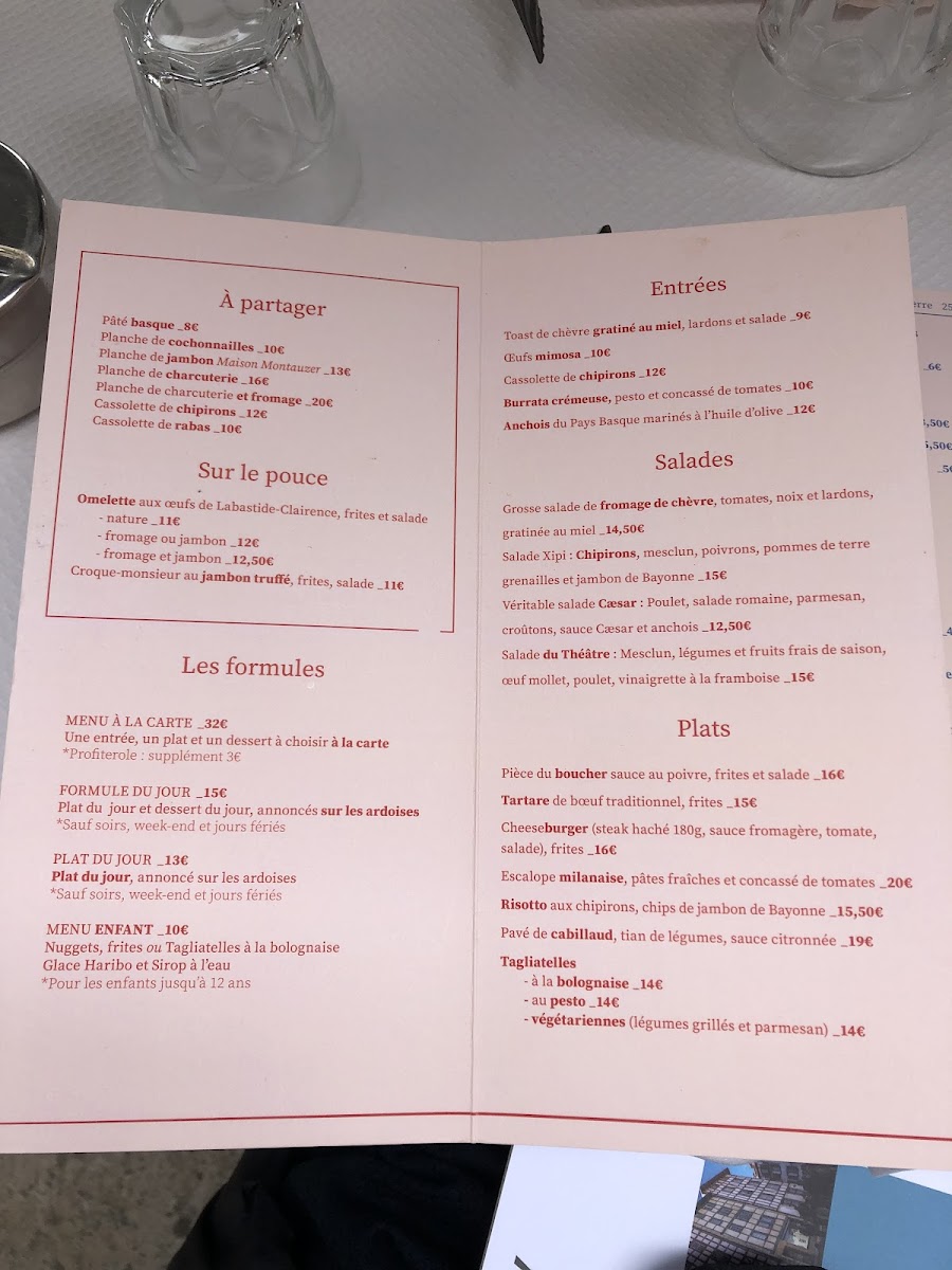 At Café Du Théatre Menu, located in the heart of Bayonne, the culinary experience is as vibrant as the city itself. Here, you can enjoy a variety of dishes crafted with fresh, local ingredients, offering a delightful mix of French classics and innovative twists. Whether you're craving a warm, comforting soup to start or a perfectly seared steak for the main course, each dish has been thoughtfully created to satisfy your taste buds. The menu also boasts a selection of indulgent pastries, perfect for those who prefer to end their meal with something sweet. Pair it all with a refreshing glass of wine from the region, and you have a meal that truly celebrates the spirit of Bayonne.